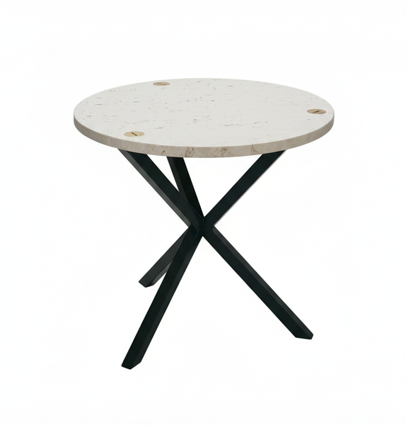 Mått: Ø 50 cm Höjd: 32, 42, 62 eller 72 cm Skiva: Travertin Underrede: Krysstativ i pulverlackerad metall Beslag: Muttrar i mässing eller rostfritt stål Tillverkning: Sverige Design: Per Söderberg