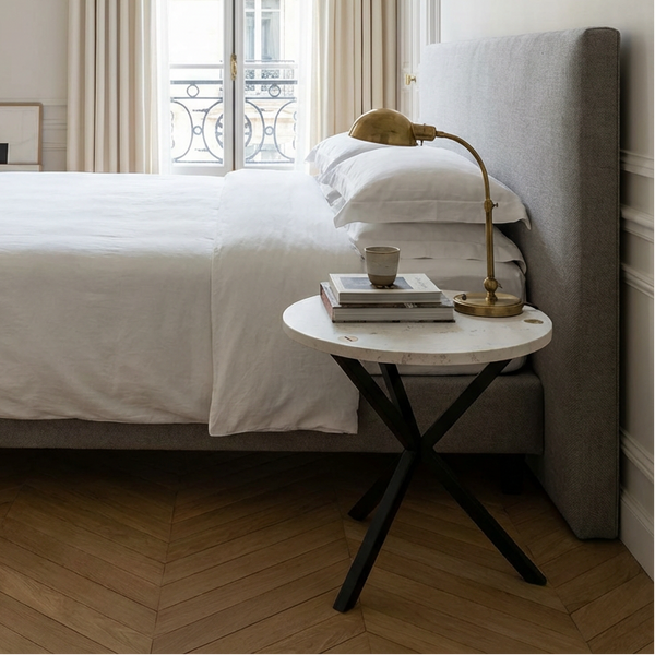 Neb sidobord med sin starka skulpturala form är ett dekorativt element i alla miljöer. Äkta travertinskiva möter eleganta kryssben i pulverlackerad metall – en kombination av nordisk funktionalism och italiensk elegans.